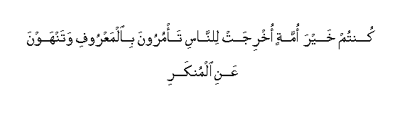 "Ye are the best community that hath been raised up for mankind. To enjoin right conduct and forbid indecency; and ye believe in Allah".