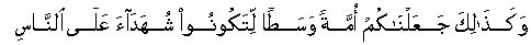 "Thus we have appointed you a middle nation that ye may be witnesses against mankind, and that the Messenger may be a witness against you". (Surah II, 143 in part).