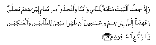 &n?sp;     "And I remember when we made the House (at Mecca) a resort for mankind and a sanctuary (saying) Take as your place of worship tile place where Abraham stood (to pray). And We imposed a duty upon Abraham and Ismail (saying) : Purify My House for those who go around and those who meditate therein and those who bend down and prostrate themselves (in worship) !. (Surah II, 125).