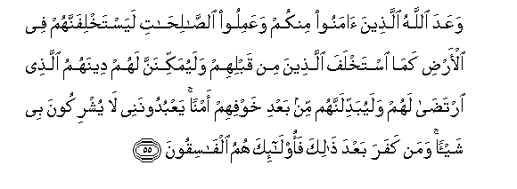 "Allah hath promised such of you as believe and do good works that He will surely make them to succeed (the present rulers) in the earth even as He caused those who were before them to succeed (others); and that He will surely establish for them their religion which He hath approved for them, and will give them in exchange safety after their fear. They serve Me. They ascribe nothing as partner unto Me. Those who disbelieve after that they are the miscreants". (Surah XXIV, ver. 55).