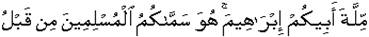 "The faith of your father Abraham, He hath named you Muslims of old time and in this (Scripture)" (Surah XXII, 78).