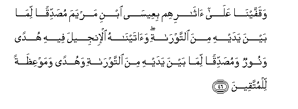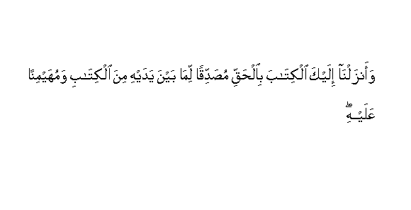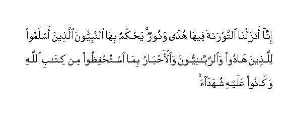"Lo ! We did reveal the Torah, where in is guidance and light, by which the Prophets who surrendered (unto Allah) judged the Jews, and the rabbis and the doctors (judged) by such of Allah�s Scripture as they were bidden to observe, and thereunto were they witnesses So fear not mankind, but fear Me. And barter not My revelations for a little gain. Whoso judgeth not by that which Allah hath revealed : such are disbelievers.. And We caused Jesus, Son of Mary, to follow in their footsteps; confirming that which was (revealed) before him in the Torah and We bestowed on him the Gospel wherein is guidance and light, confirming that which was (revealed) before it in the Torah - a guidance and an admonition unto those who ward off (evil) And unto thee have We revealed the Scripture with the truth, confirming whatever Scripture was before it, and a watcher over it" (Surah V, verses 44, 46, 48 - in part).