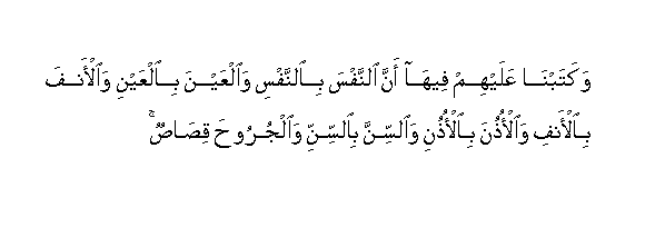 "And We prescribed for them therein : The life for the life and the eye for the eye, and the nose for the nose, and the ear for the ear, and the tooth for the tooth and for wounds retaliation, But whoso forgoeth it (in the way of charity) it shall be expiation for him". (Surah V, 45 - in part)