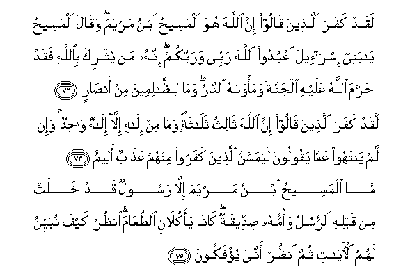 72) "They surely disbelieve who say : Lo ! Allah is the Messiah, son of Mary. The Messiah (himself) said : O children of Israel ! worship Allah, my Lord and your Lord. Lo! whoso ascribeth partners unto Allah, for him Allah hath forbidden Paradise. His abode is Fire; For evil-doers there will be no helpers.