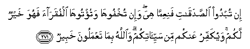 "If you publish your alms-giving, it is well, but you hide it and give it to the poor, it will better for you and will atone for some of your ill-deeds. Allah Informed of what ye do". (Surah Al Baqara, ver. 271).