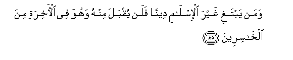 "And he whoso sekeeth as religion other than Islam (the Surrender to Allah) it will not be accepted from him and he will be a loser in the Hereafter" . (Surah Al -Imran, ver. 85).