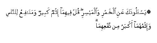 "They question thee about wines and games of chance. Say : In both is great ?in and some utility for men ; but the sin of them is greater than their usefulness". (Surah Al Baqara, verse 299 in part).