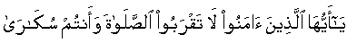"O ye who believe ! Draw not near unto prayer when ye are drunken, till ye know that which ye utter". (Surah Al Nisaa, verse 43 in part).