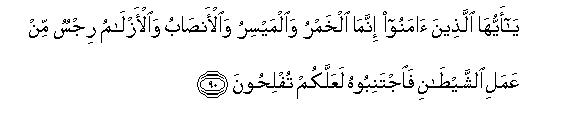 "O ye who believe! Wines and games of chance and idols and divining arrows are only an infamy of Satan's handwork. Leave it aside in order that ye may succeed". (Surah Al Ma'ida, verse 90).