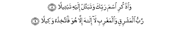 "And remember the name of thy Lord and devote thyself to Him with a complete devotion Lord of the East and the West ; there is no God save Him ; so choose Him, alone for thy defender". (Surah 73, ver 8, 9).